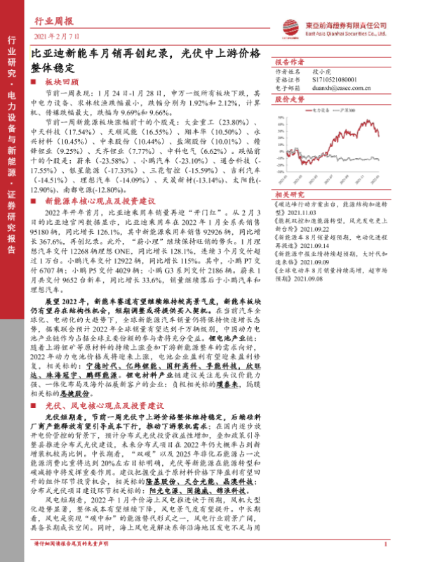 【东亚前海证券】【20220207】电力设备与新能源行业周报:比亚迪新能车月销再创纪录,光伏中上游价格整体稳定-26页