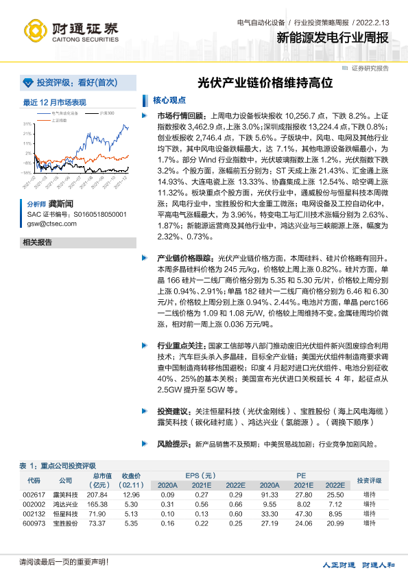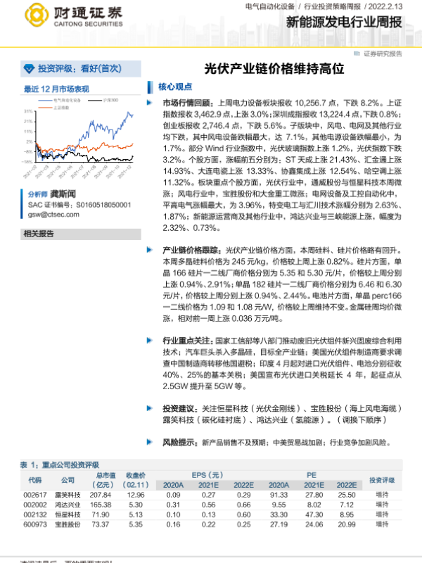 【财通证券】【20220213】新能源发电行业周报:光伏产业链价格维持高位-16页