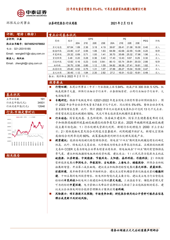 【中泰证券】【20220213】22年用电量有望增长5%-6%,可再生能源装机规模大幅增长可期-22页