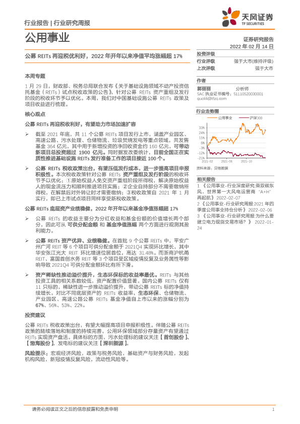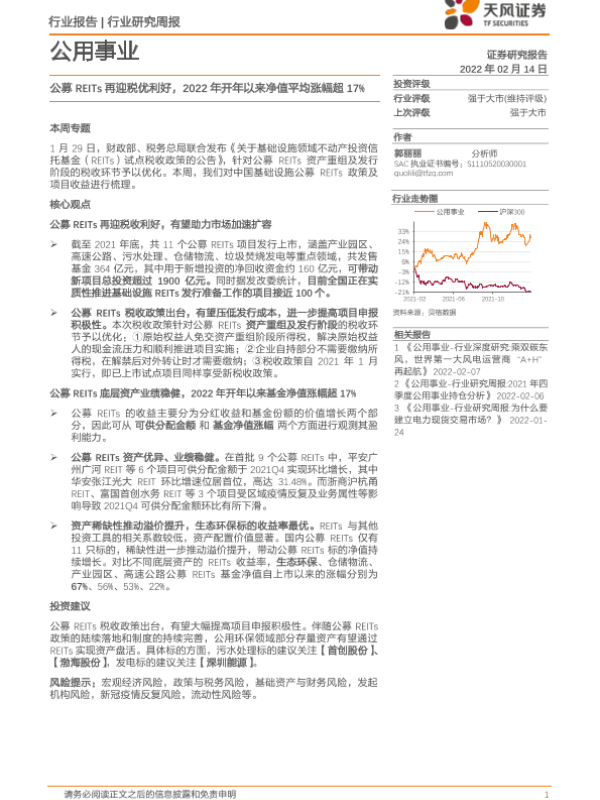 【天风证券】【20220214】公用事业行业研究周报:公募REITs再迎税优利好,2022年开年以来净值平均涨幅超17%-14页