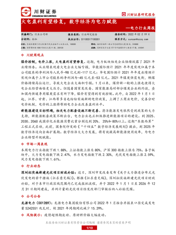 【川财证券】【20220219】电力行业周报:火电盈利有望修复,数字经济为电力赋能-10页