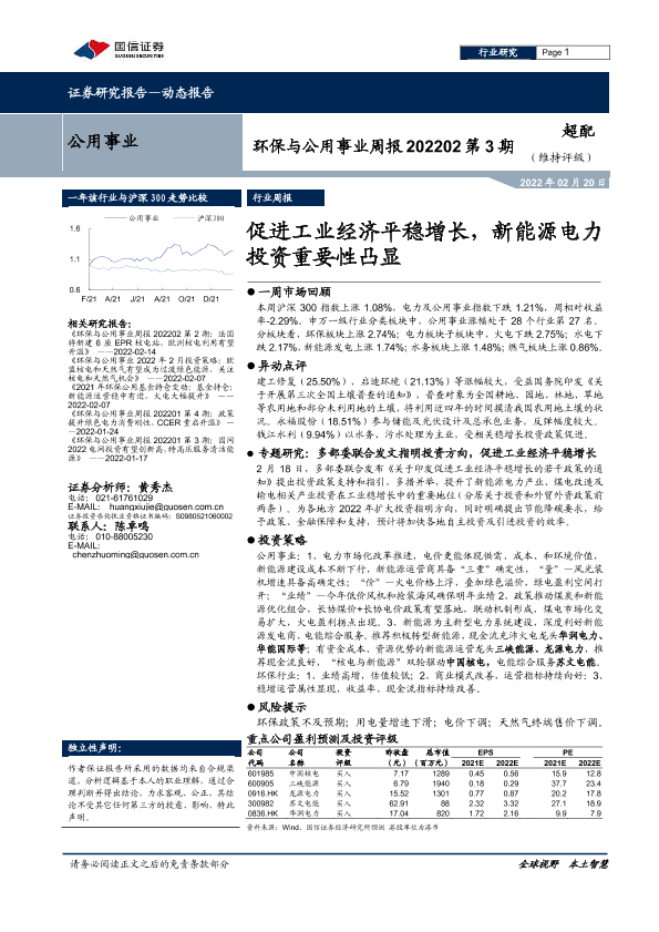 【国信证券】【20220220】环保与公用事业周报202202第3期:促进工业经济平稳增长,新能源电力投资重要性凸显-24页