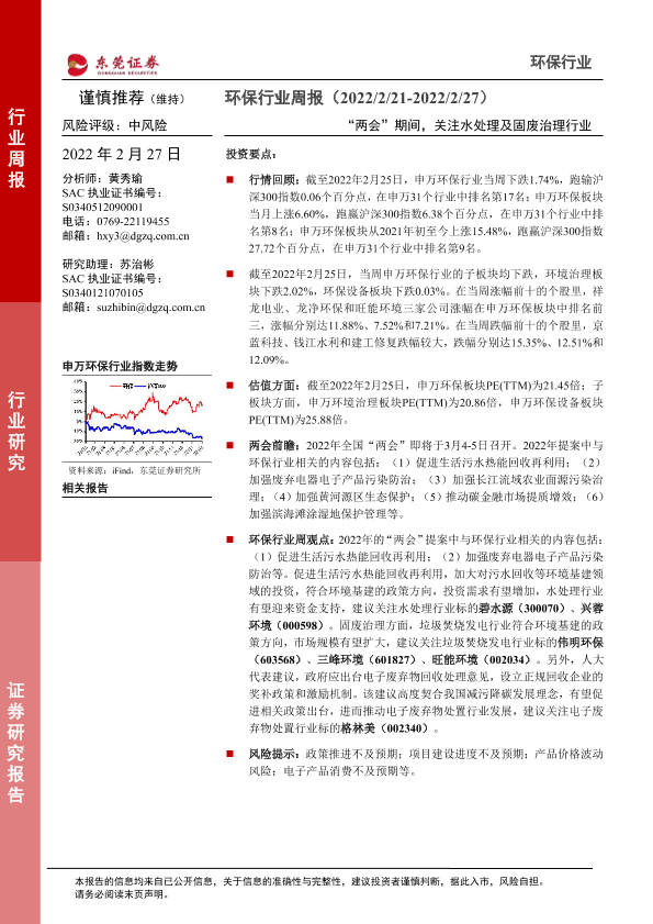 【东莞证券】【20220227】环保行业周报:“两会”期间,关注水处理及固废治理行业-10页