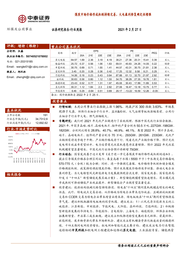 【中泰证券】【20220227】环保及公用事业行业周报:煤炭市场价格形成机制持续完善,火电盈利修复确定性增强-22页
