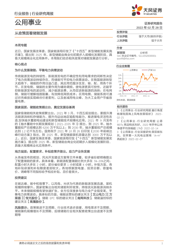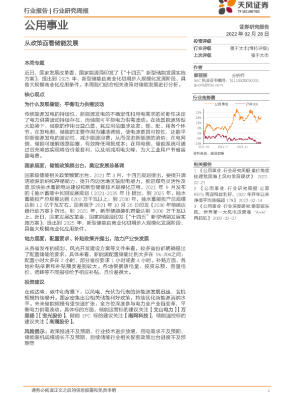 【天风证券】【20220228】公用事业行业研究周报:从政策面看储能发展-20页