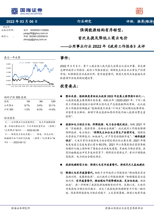 【国海证券】【20220306】公用事业行业2022年《政府工作报告》点评:强调能源结构有序转型,首次未提及降低工商业电价-5页
