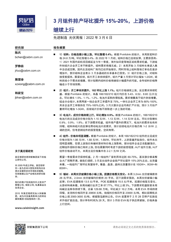 【莫尼塔研究】【20220306】先进制造光伏周报:3月组件排产环比提升15%-20%,上游价格继续上行-15页