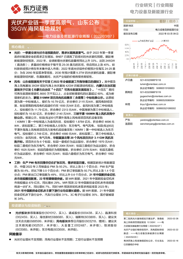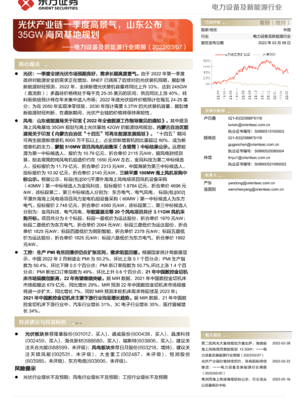 【东方证券】【20220309】电力设备及新能源行业周报:光伏产业链一季度高景气,山东公布35GW海风基地规划-17页