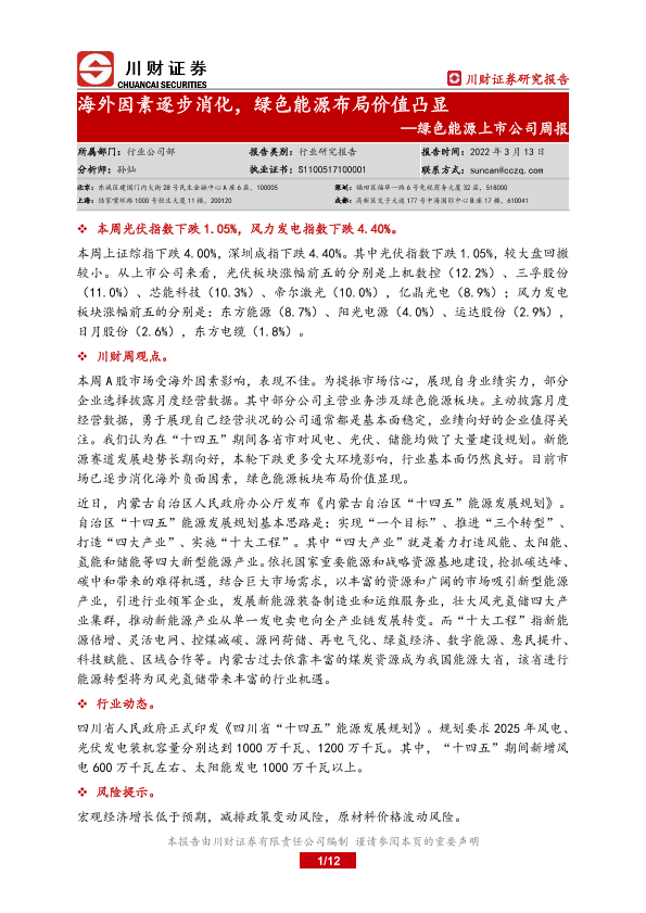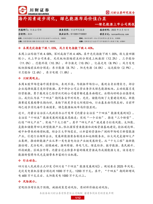 【川财证券】【20220313】绿色能源上市公司周报:海外因素逐步消化,绿色能源布局价值凸显-12页