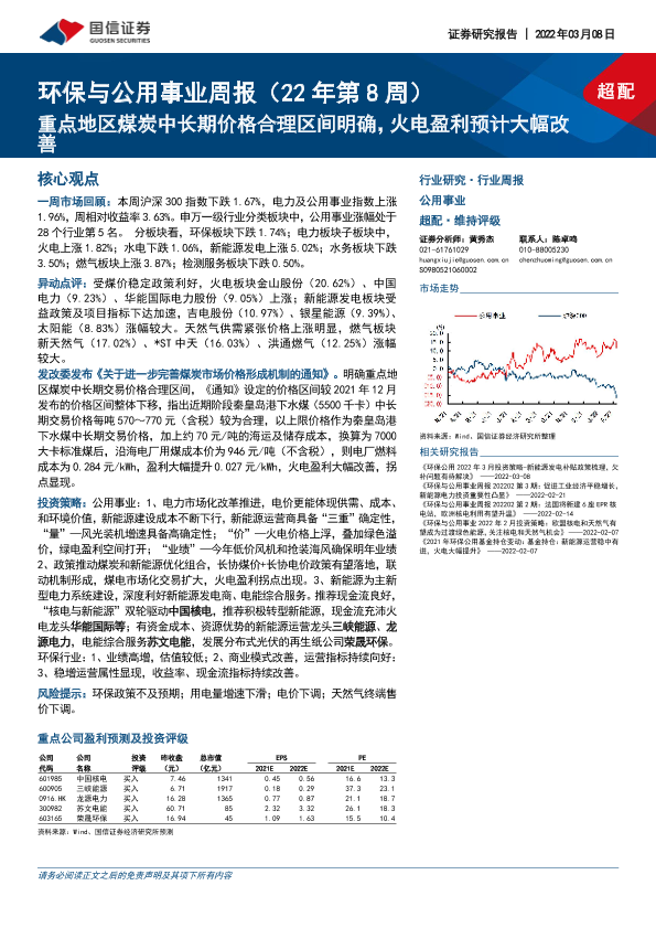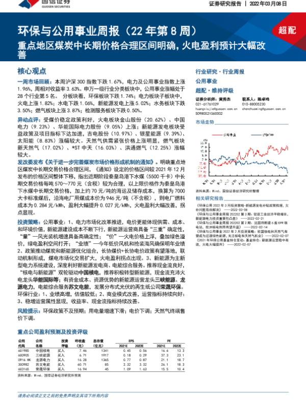 【国信证券】【20220308】环保与公用事业周报:重点地区煤炭中长期价格合理区间明确,火电盈利预计大幅改善-26页