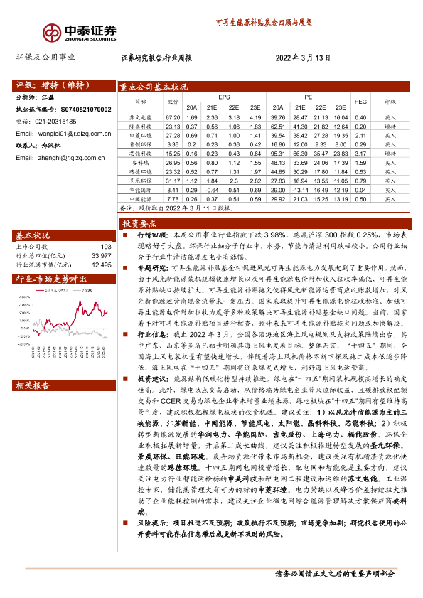 【中泰证券】【20220313】环保及公用事业行业周报:可再生能源补贴基金回顾与展望-19页