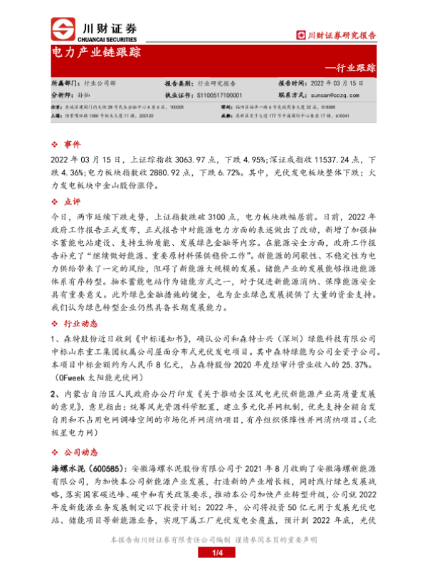 【川财证券】【20220315】电力产业链跟踪-4页