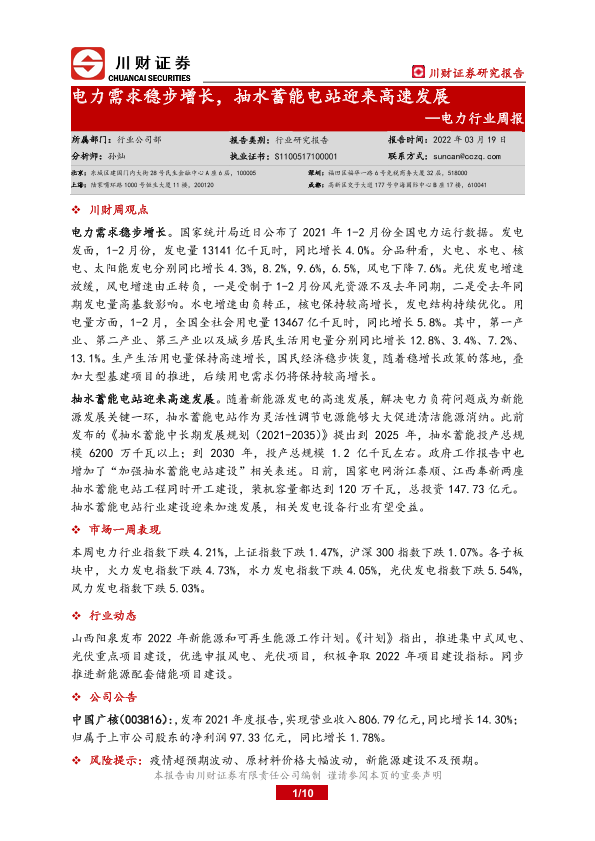 【川财证券】【20220319】电力需求稳步增长,抽水蓄能电站迎来高速发展-10页