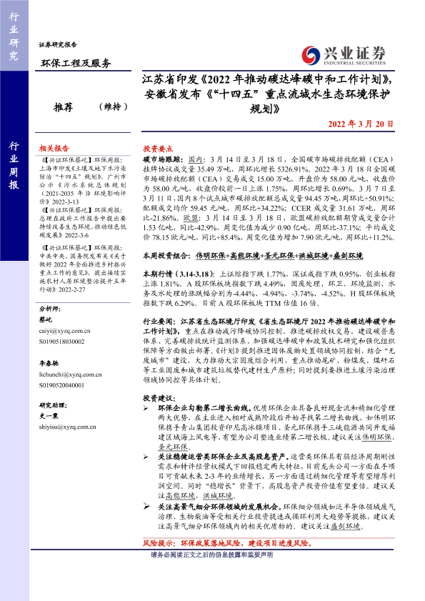 【兴业证券】【20220320】环保工程及服务行业周报:江苏省印发《2022年推动碳达峰碳中和工作计划》,安徽省发布《“十四五”重点流域水生态环境保护规划》-9页