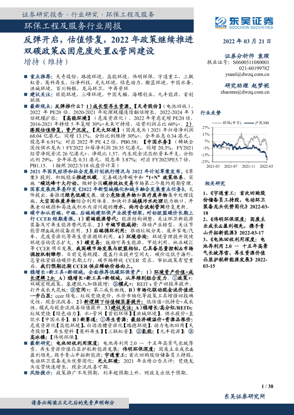 【东吴证券】【20220321】环保工程及服务行业周报:反弹开启,估值修复-38页