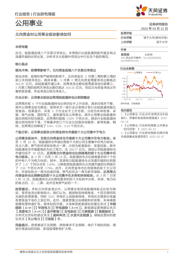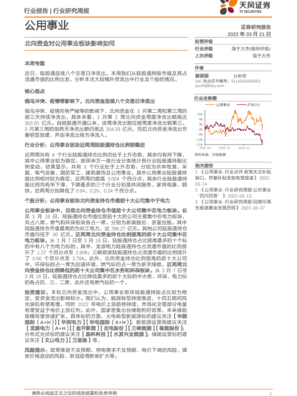 【天风证券】【20220321】公用事业行业研究周报:北向资金对公用事业板块影响如何-13页