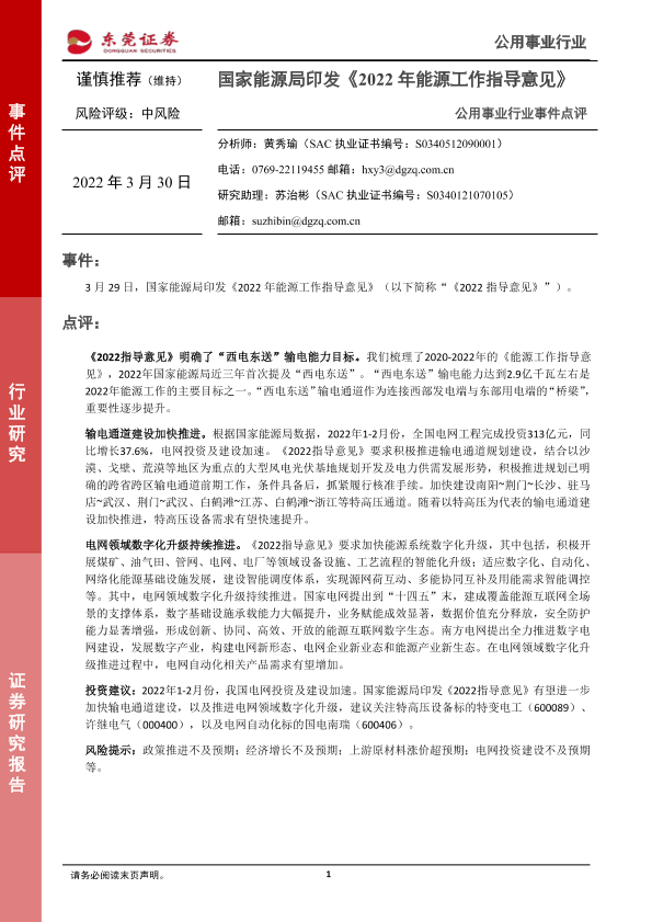 【东莞证券】【20220330】公用事业行业事件点评:国家能源局印发《2022年能源工作指导意见》-2页
