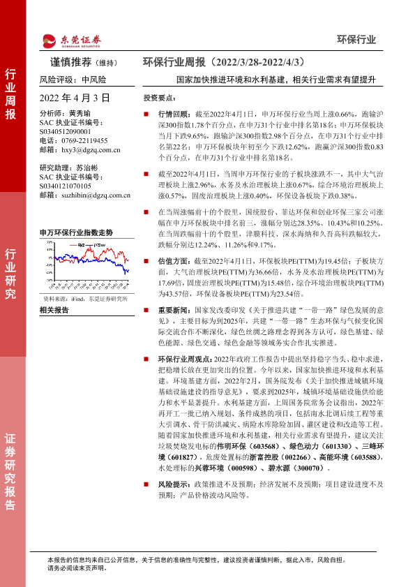 【东莞证券】【20220403】环保行业周报:国家加快推进环境和水利基建,相关行业需求有望提升-10页