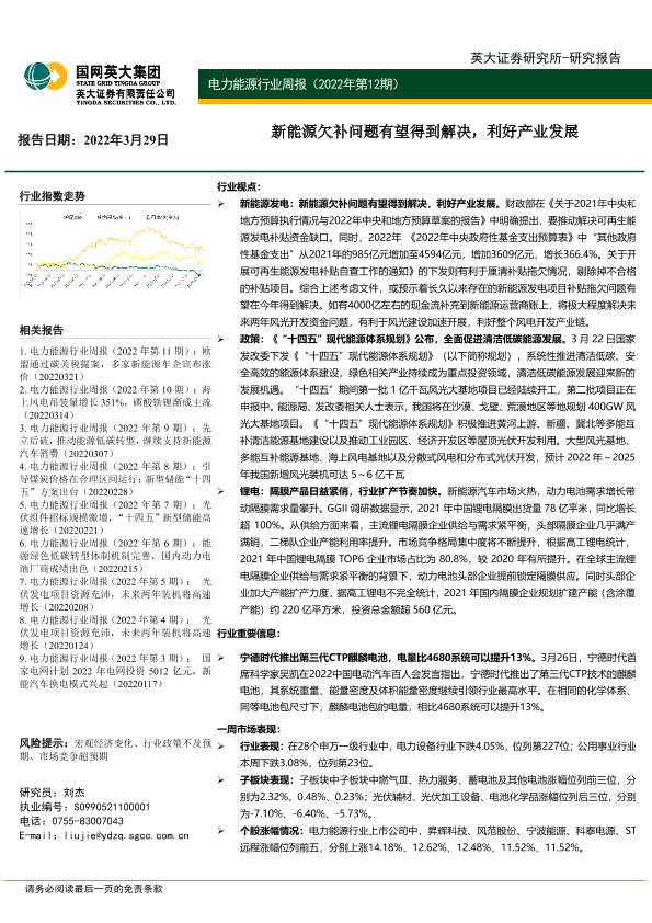 【英大证券】【20220329】电力能源行业周报:新能源欠补问题有望得到解决,利好产业发展-33页