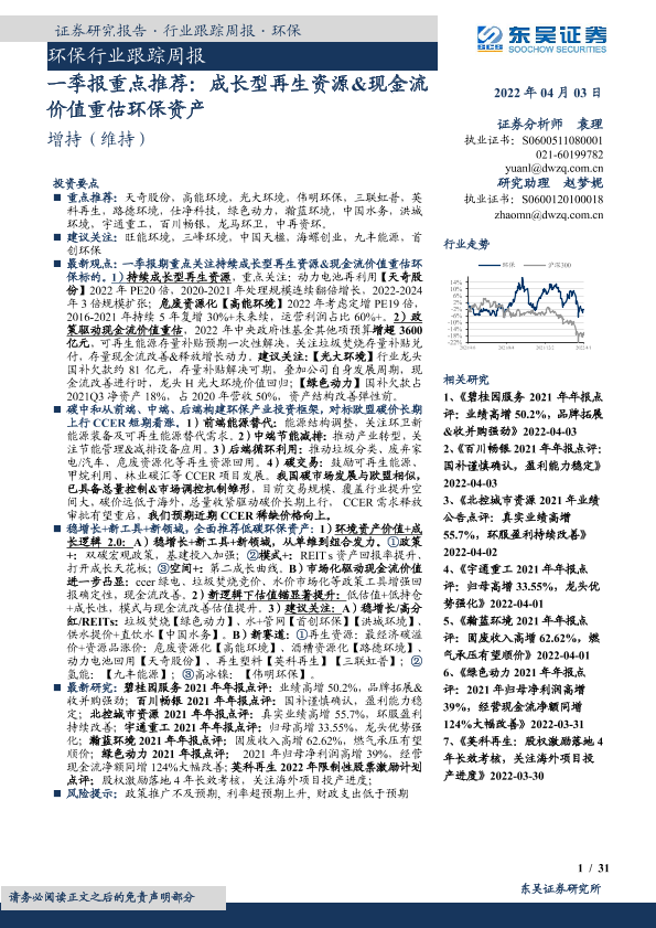 【东吴证券】【20220403】环保行业跟踪周报:一季报重点推荐:成长型再生资源&现金流价值重估环保资产-31页