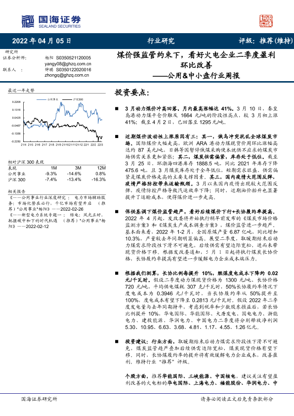 【国海证券】【20220405】煤价强监管约束下,看好火电企业二季度盈利环比改善-16页