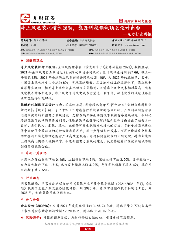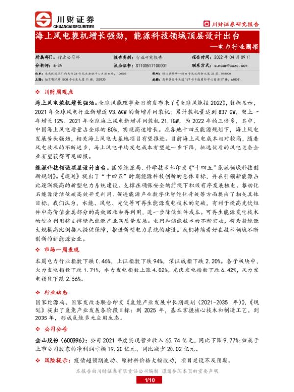 【川财证券】【20220409】电力行业周报:海上风电装机增长强劲,能源科技领域顶层设计出台-10页