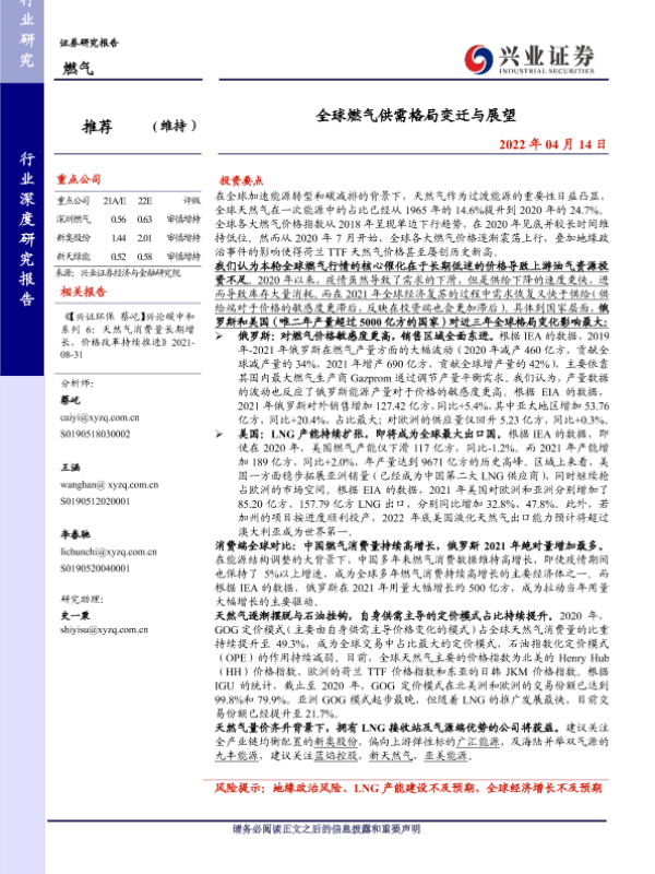 【兴业证券】【20220414】全球燃气供需格局变迁与展望-23页