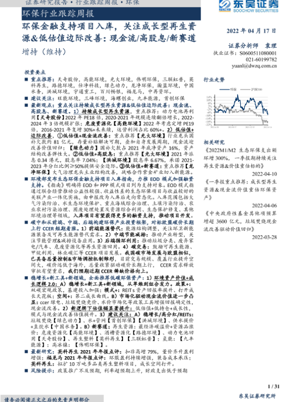 【东吴证券】【20220417】环保行业跟踪周报:环保金融支持项目入库,关注成长型再生资源&低估值边际改善-31页