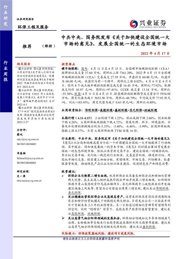【兴业证券】【20220417】关于加快建设全国统一大市场的意见发布,发展全国统一的生态环境市场-10页