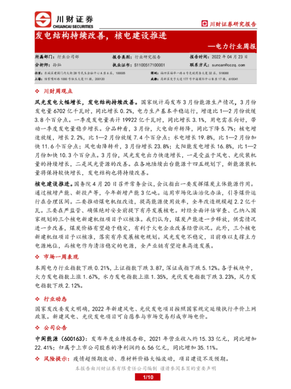 【川财证券】【20220423】电力行业周报:发电结构持续改善,核电建设推进-10页