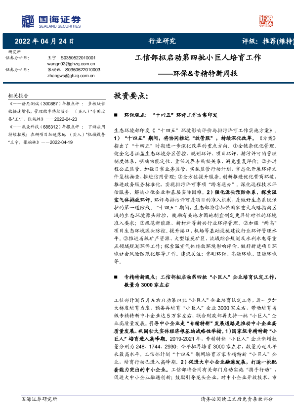 【国海证券】【20220424】环保&专精特新周报:工信部拟启动第四批小巨人培育工作-18页