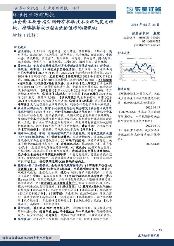 【东吴证券】【20220424】社会资本投资指引利好有机物技术和沼气发电板块,持续推荐成长型和低估值标的-33页