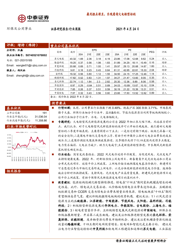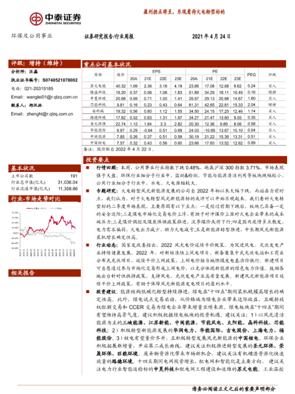 【中泰证券】【20220424】环保及公用事业行业周报:盈利拐点将至,乐观看待火电转型标的-22页