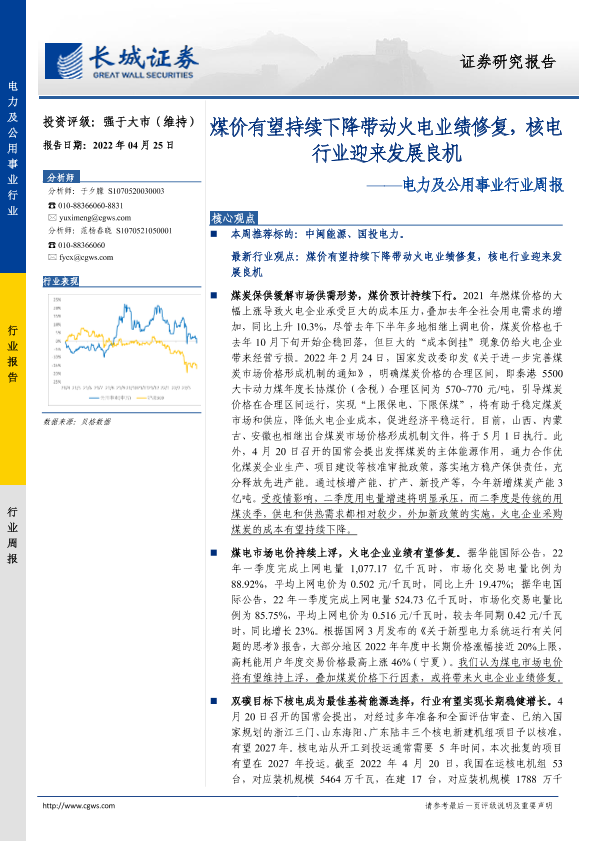 【长城证券】【20220425】电力及公用事业行业周报:煤价有望持续下降带动火电业绩修复,核电行业迎来发展良机-12页