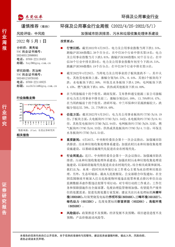 【东莞证券】【20220501】环保及公用事业行业周报:加强城市防洪排涝、污水和垃圾收集处理体系建设-10页