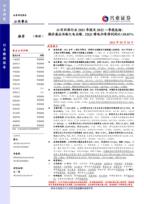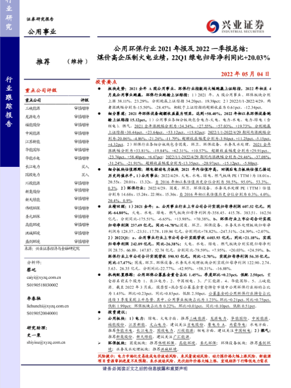 【兴业证券】【20220504】公用环保行业2021年报及2022一季报总结-34页