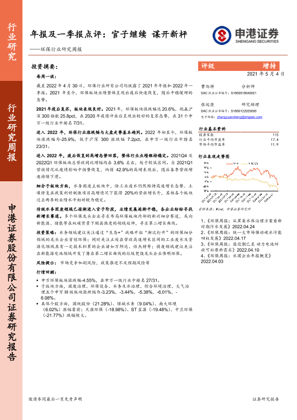 【申港证券】【20220504】环保行业研究周报:年报及一季报点评:官子继续 谋开新枰-23页