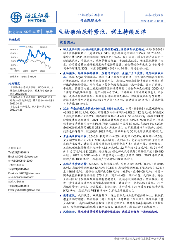 【海通证券】【20220508】公用事业行业跟踪报告:生物柴油原料紧张,稀土持续反弹-8页