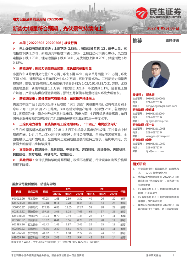 【民生证券】【20220508】电力设备及新能源周报:新势力销量符合预期,光伏景气持续向上-26页