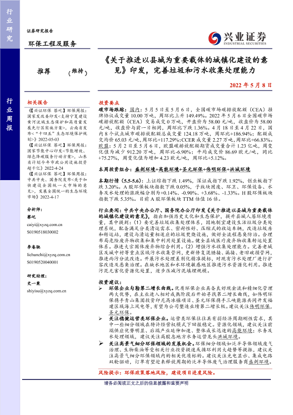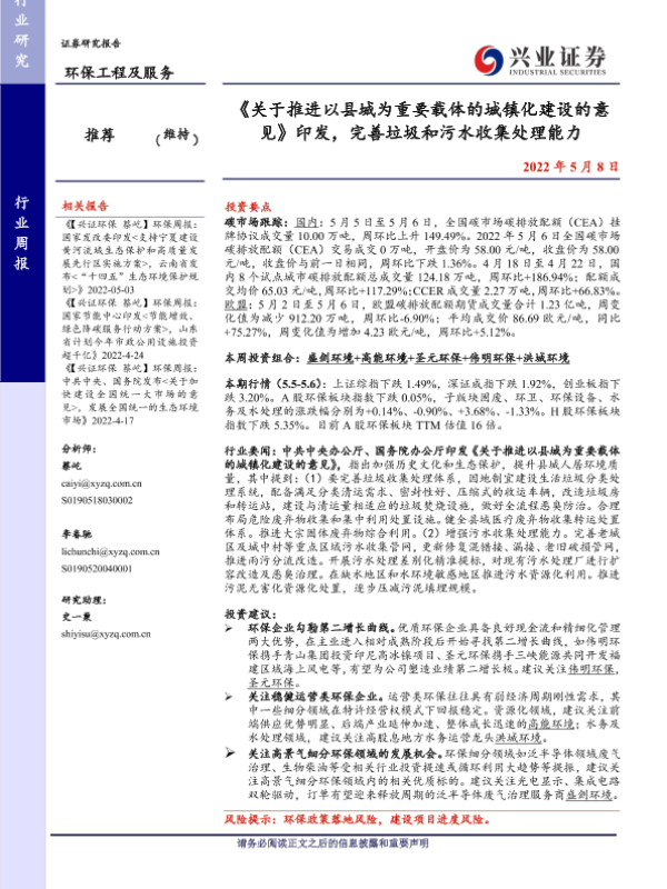 垃圾处理 城镇化建设 污水收集处理 环保工程 碳市场