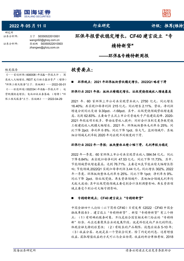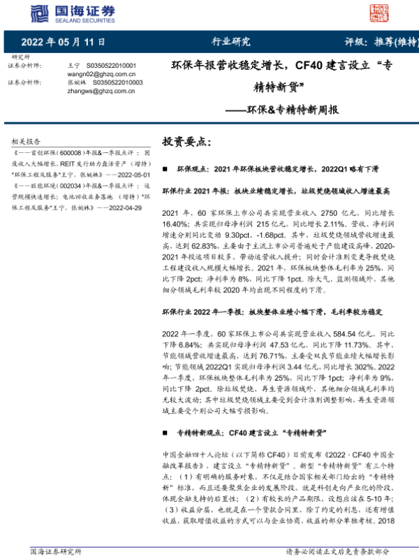 【国海证券】【20220511】环保年报营收稳定增长,CF40建言设立“专精特新贷”-18页