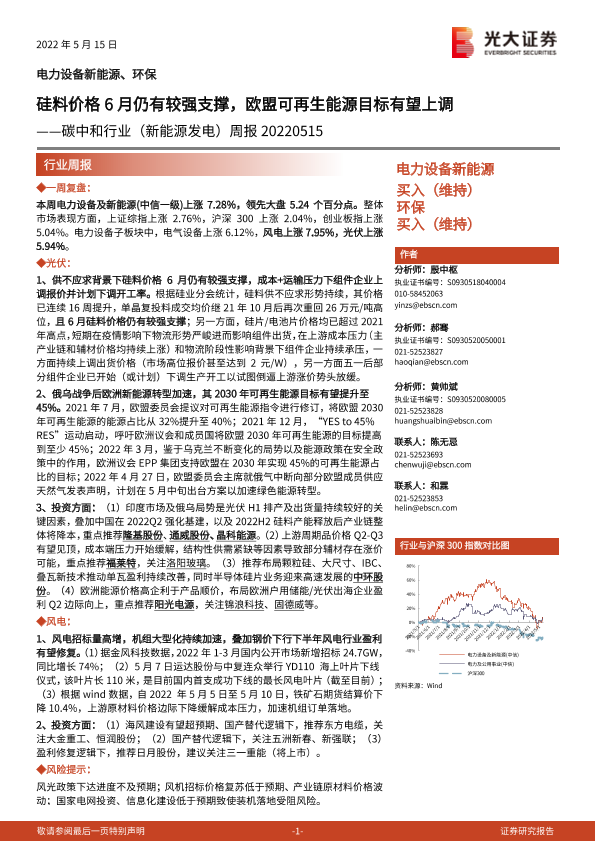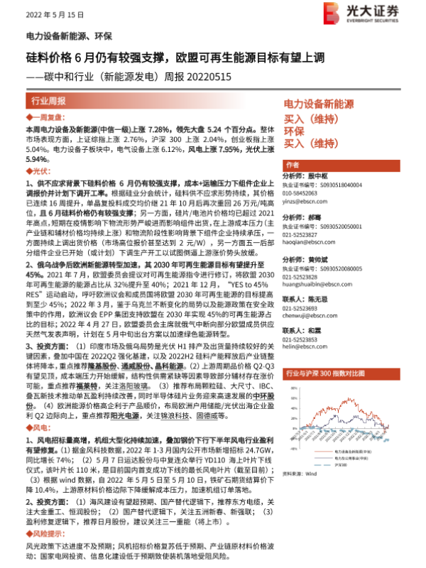 【光大证券】【20220515】碳中和行业(新能源发电)周报:硅料价格6月仍有较强支撑,欧盟可再生能源目标有望上调-9页