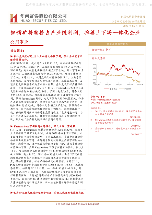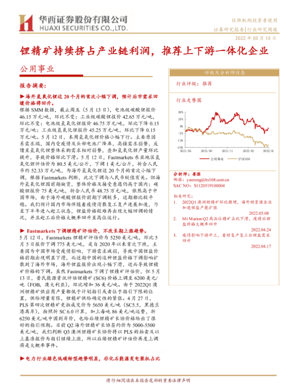 【华西证券】【20220515】公用事业行业研究周报:锂精矿持续挤占产业链利润,推荐上下游一体化企业-16页