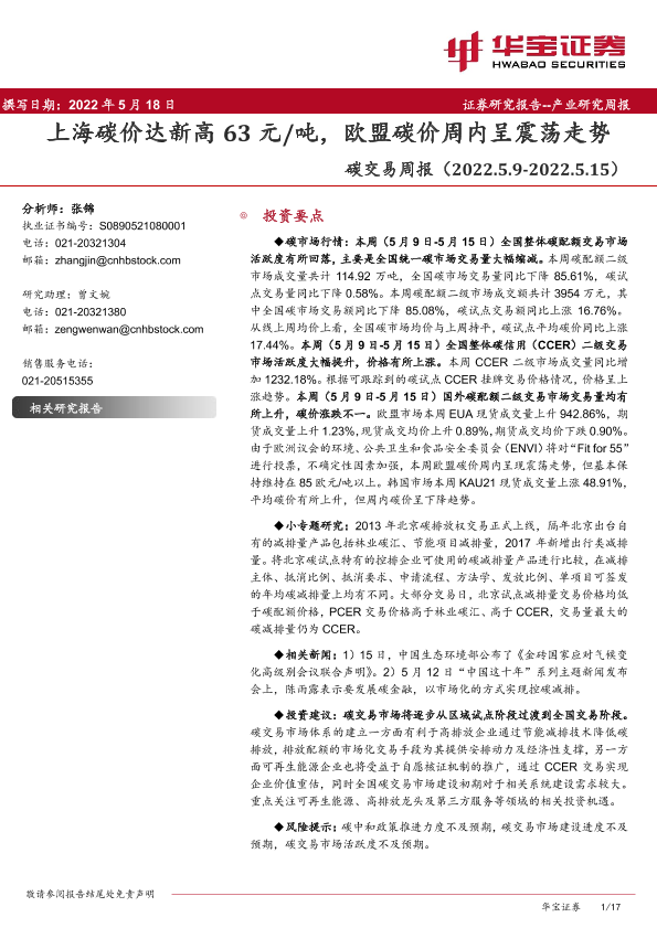 【华宝证券】【20220518】碳交易周报:上海碳价达新高63元 吨,欧盟碳价周内呈震荡走势-17页