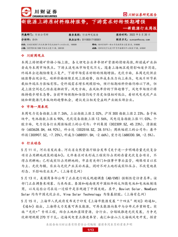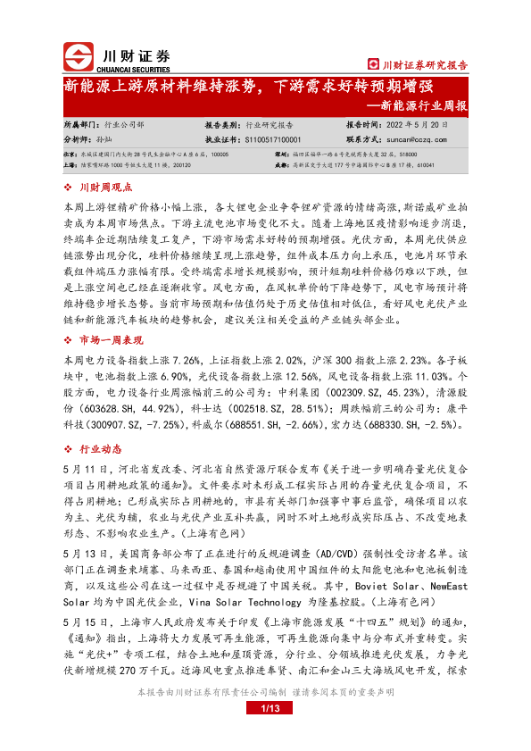 【川财证券】【20220520】新能源行业周报:新能源上游原材料维持涨势,下游需求好转预期增强-13页