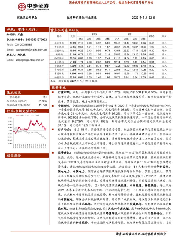 【中泰证券】【20220522】环保及公用事业行业周报:国企优质资产有望持续注入上市公司,关注具备优质体外资产标的-21页