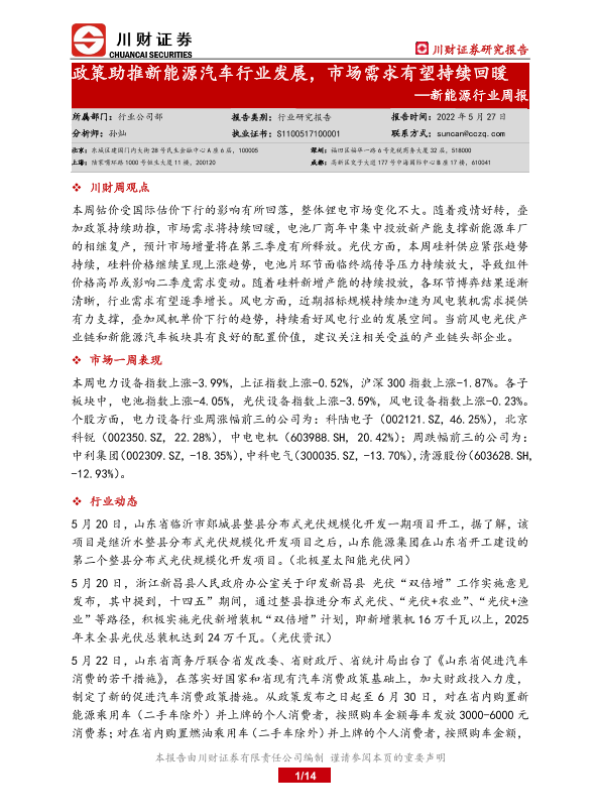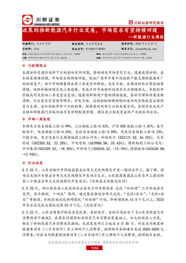 【川财证券】【20220527】政策助推新能源汽车行业发展,市场需求有望持续回暖-14页