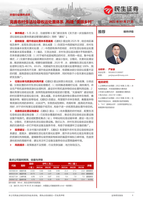 【民生证券】【20220527】环保行业事件点评:完善农村生活垃圾收运处置体系,构建“美丽乡村”-2页