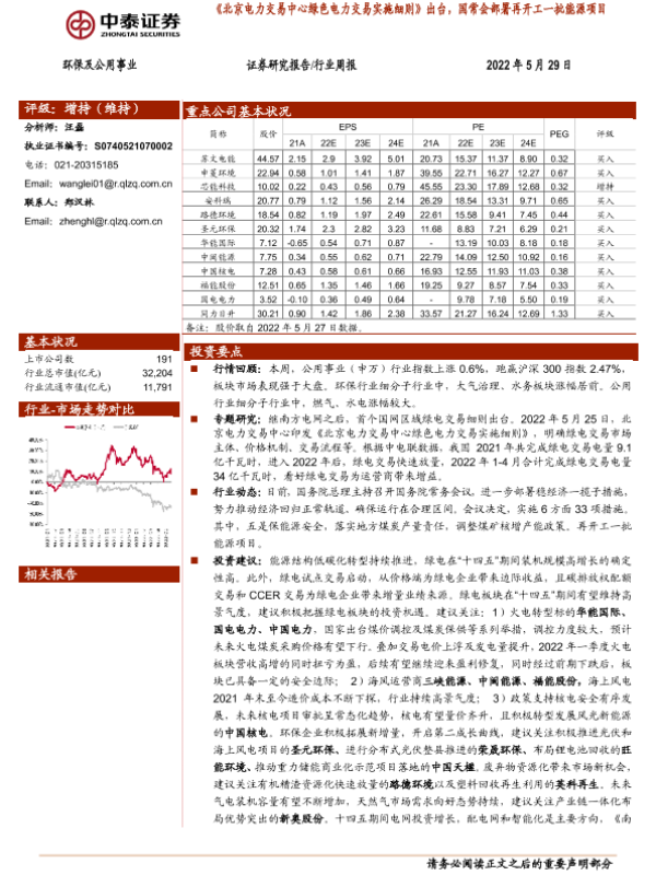 【中泰证券】【20220529】环保及公用事业行业周报:《北京电力交易中心绿色电力交易实施细则》出台,国常会部署再开工一批能源项目-22页