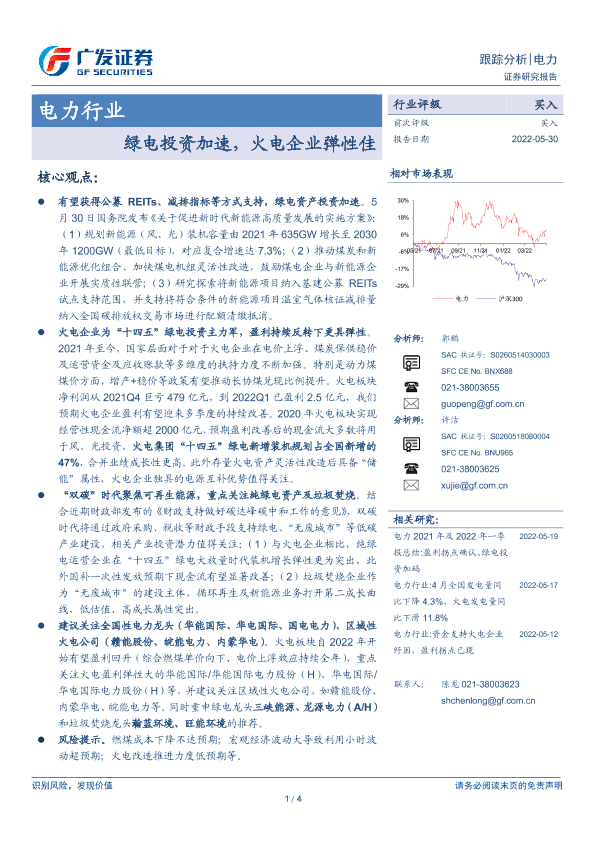 【广发证券】【20220530】电力行业:绿电投资加速,火电企业弹性佳-4页